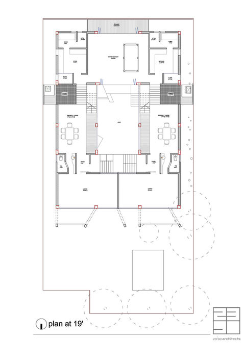 The clients were brothers in relation. Their requirement was two individual duplexes for each of them and their mother’s suit which must be connected with both duplexes. Existing use of the site was a naval gas pump (marine refueling center) and a small office. Client requested to kept both. The concept was derived from the site forces which includes a river that was not visible, as it’s view from the construction zone was being obstructed by a mosque in front of it. The site is also prone to flooding and the surrounding is in mixed used industrial zone with sound and vapor pollution. To protect the structure from effects of flood, the dwelling was raised fifteen feet which also ensured the view to the river. Introvert planning was the goal to protect the dwelling from surrounding and construct its own breathing space.